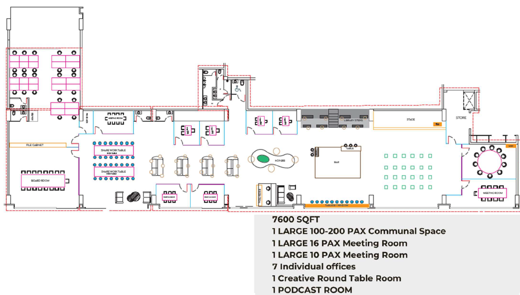 Spacious seating, High Speed Internet, Cafe Lounge, Snacks & Coffee, Printers & Scanners, Podcast room, Break Room, Large presentation room.